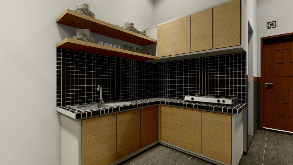 Dapur tetap menjadi area penting yang perlu dirancang nyaman serta mudah digunakan. Penataan kabinet serta area memasak dibuat efisien agar aktivitas dapur berjalan lancar.