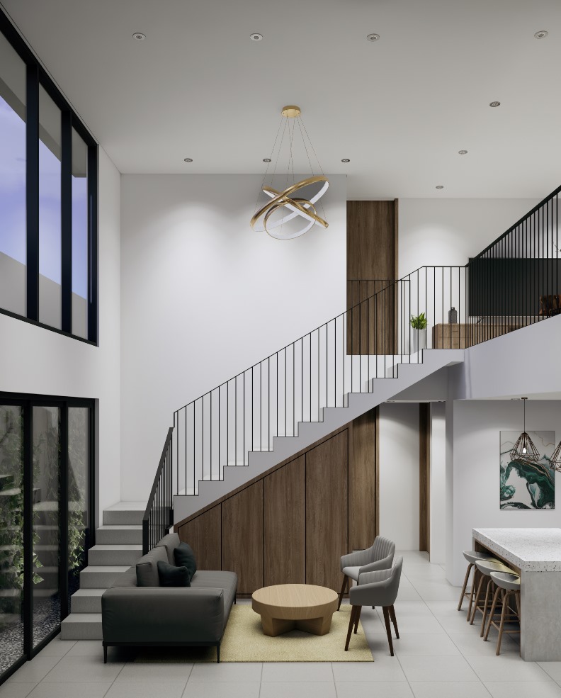 Interior rumah dua lantai perlu dirancang agar tetap nyaman sekaligus memiliki alur ruang yang efisien. Pemilihan furniture sederhana membantu menjaga ruangan tetap terasa luas dan rapi.